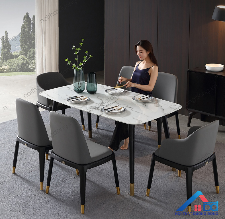 – Mặt đá sang trọng với hoa văn sinh động kết hợp kiểu chân côn bọc đồng tạo điểm nhấn cho bộ bàn ăn phong cách hiện đại và phá cách.
