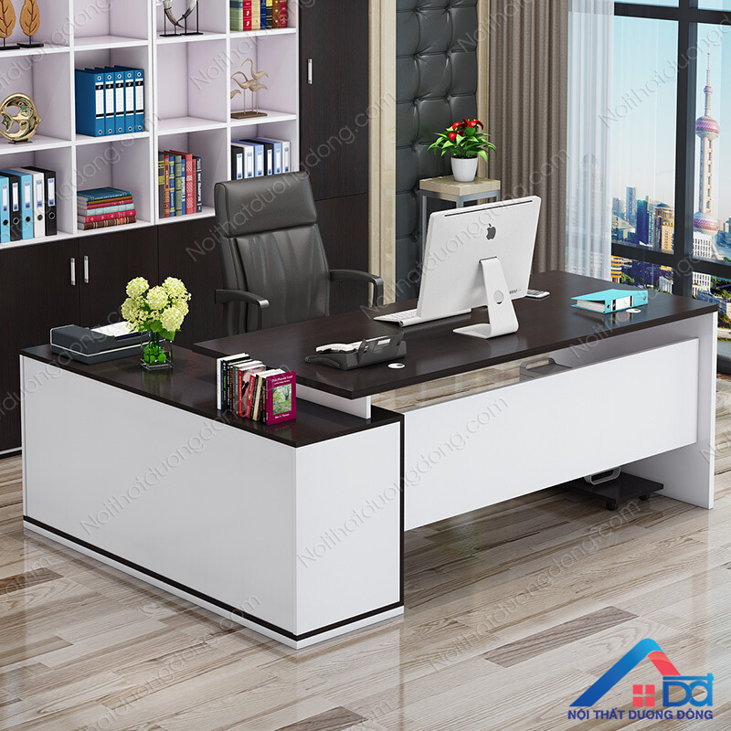 được làm bằng gỗ công nghiệp MFC phủ Melamine. Mặt bàn hình chữ nhật. Có tủ phụ đi kèm, thường được dùng cho lãnh đạo: trưởng phòng, giám đốc,.…thuộc dòng bàn cao cấp của Nội thất Dương Đông Với độ dày mặt bàn 25mm,
