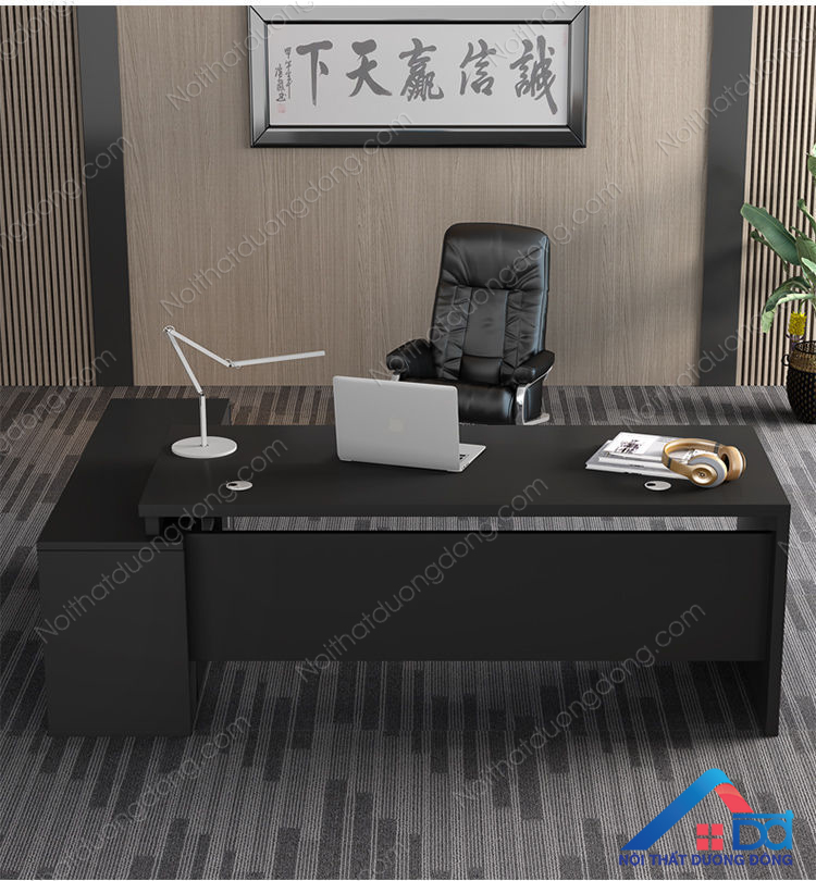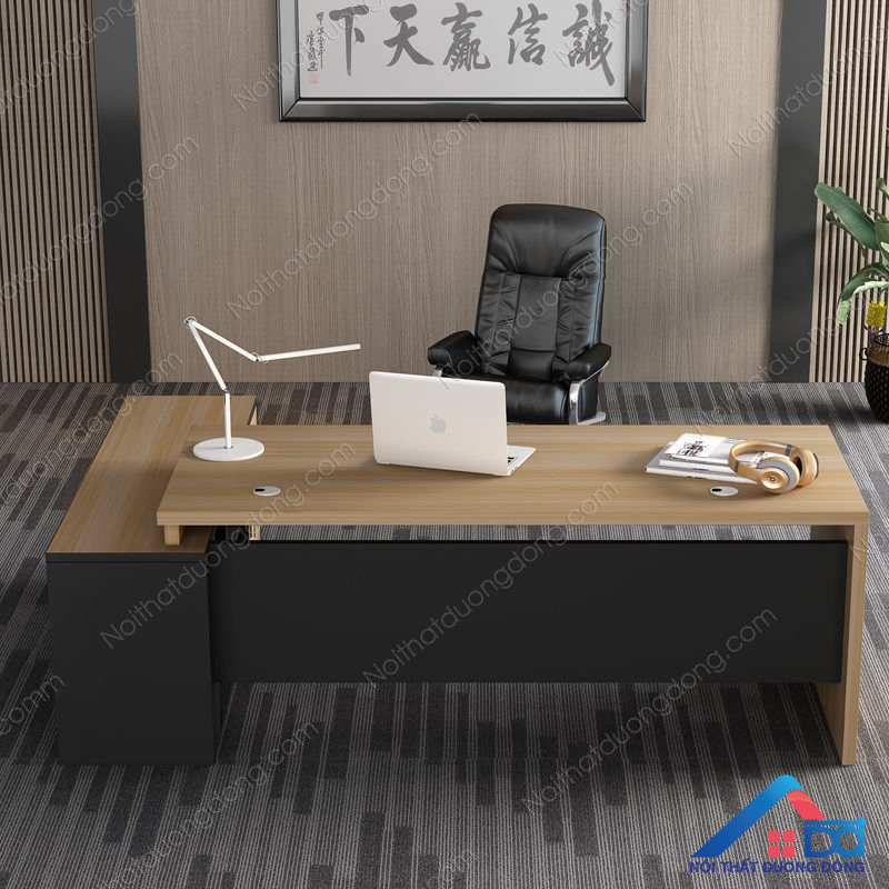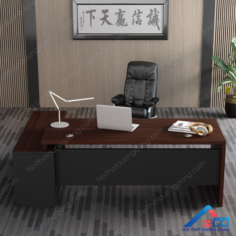 được làm bằng gỗ công nghiệp MFC phủ Melamine. Mặt bàn hình chữ nhật. Có tủ phụ đi kèm, thường được dùng cho lãnh đạo: trưởng phòng, giám đốc,.…thuộc dòng bàn cao cấp của Nội thất Dương Đông Với độ dày mặt bàn 25mm,