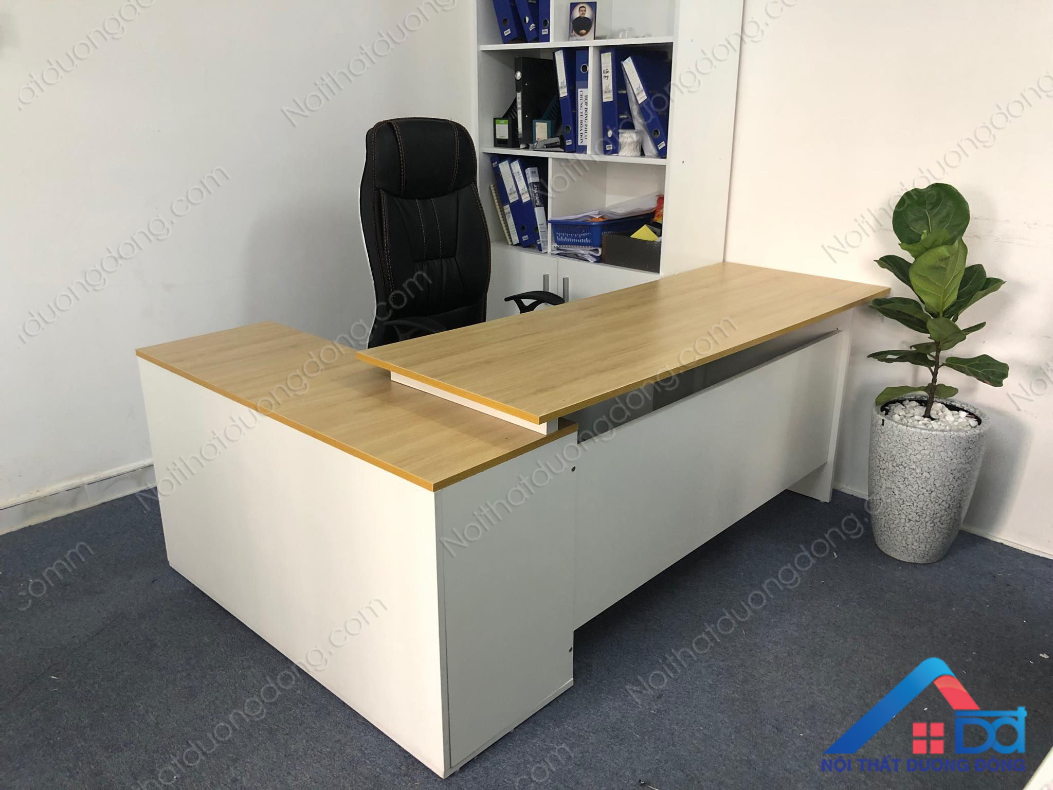 được làm bằng gỗ công nghiệp MFC phủ Melamine. Mặt bàn hình chữ nhật. Có tủ phụ đi kèm, thường được dùng cho lãnh đạo: trưởng phòng, giám đốc,.…thuộc dòng bàn cao cấp của Nội thất Dương Đông Với độ dày mặt bàn 25mm,