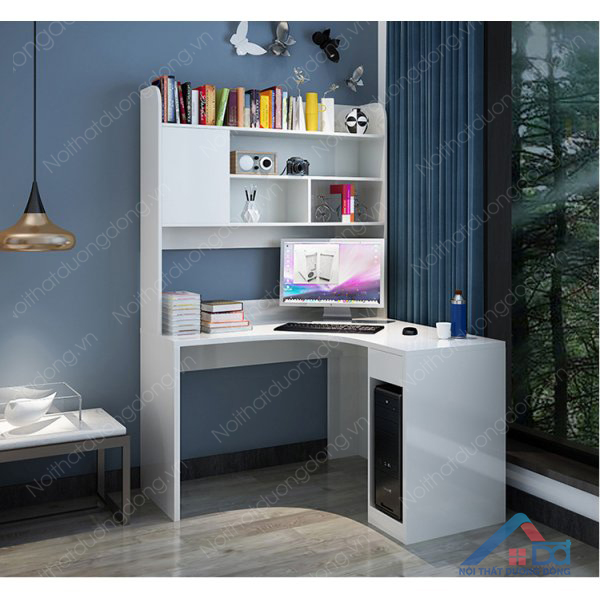 Bàn học chữ L có giá sách là dòng sản phẩm dành riêng cho không gian làm việc tại nhà với những thiết kế trẻ trung, hiện đại pha trộn giữa sự mềm mại, nhiều màu sắc của gia đình và chút cứng cáp trong không gian văn phòng và làm bằng gỗ công nghiệp MFC. Mặt bàn phủ Melamine giúp chống trầy xước và ẩm mốc, bóng đẹp theo thời gian. Mặt bàn dày 18mm ( Hoặc 25mm nếu theo yêu cầu).