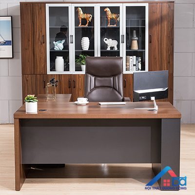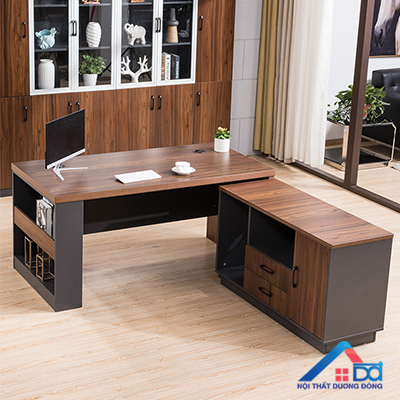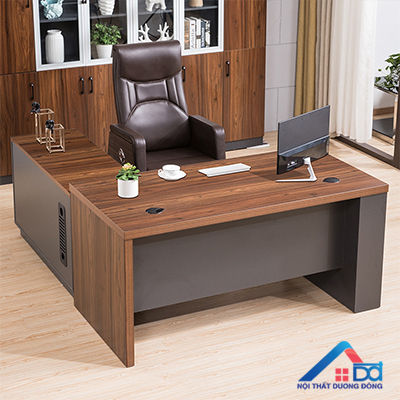 Bàn lãnh đạo kèm tủ phụ hiện đại được làm bằng gỗ công nghiệp MFC phủ Melamine chất lượng cao. Mặt bàn hình chữ nhật. Có tủ phụ đi kèm bên bàn, bàn thường được dùng cho lãnh đạo: trưởng phòng, giám đốc,.…thuộc dòng bàn cao cấp của Nội thất Dương Đông.