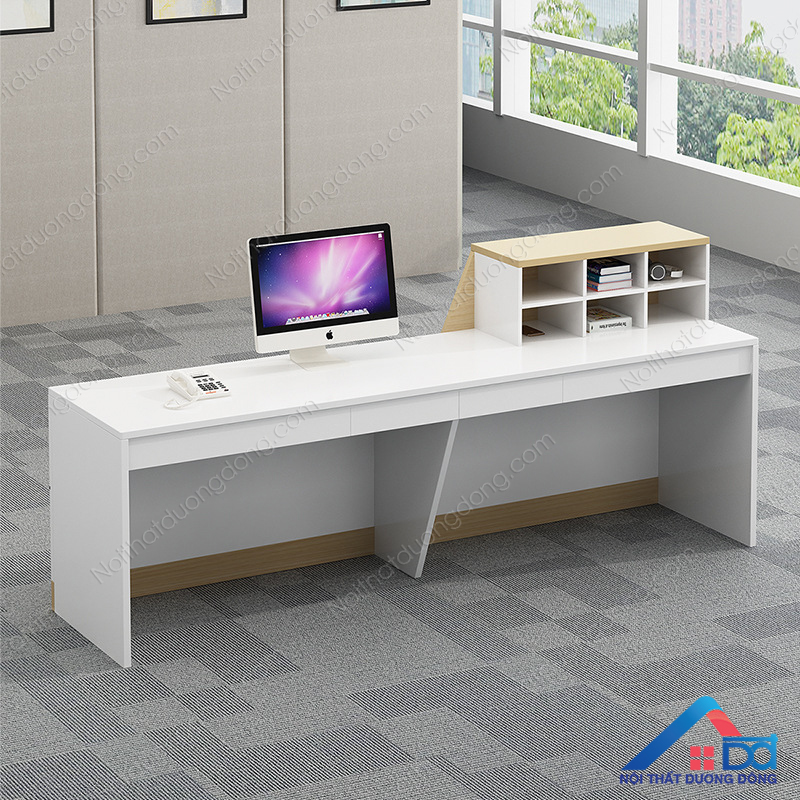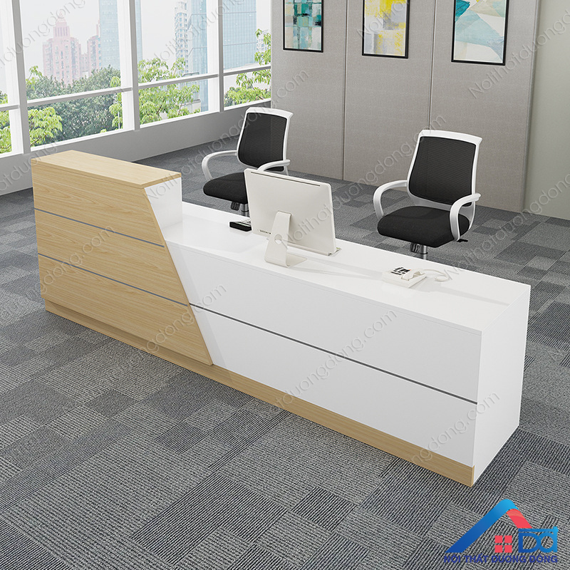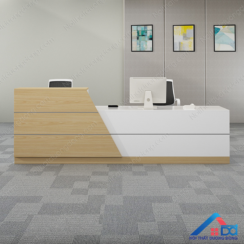 Kích thước bàn quầy lễ tân tại mỗi công ty khác nhau tùy theo diện tích mặt bằng mà có thiết kế phù hợp để khi khách hàng hay đối tác của công ty bước vào có thể gây được ấn tượng với họ bởi bàn quầy lễ tân thường được đặt gần tại vị trí ra vào của công ty là bộ mặt đại diện cho công ty đồng thời còn hỗ trợ khách hàng và đối tác có được thông tin mà họ mong muốn một cách nhanh chóng nhất. Vì vậy thiết kế bàn quầy lễ tân như thế nào cho phù hợp với diện tích mặt bằng và hợp phong thủy là điều hết sức quan trọng. Nội thất Dương Đông tự hào là đơn vị với nhiều năm kinh nghiệm trong việc thiết kế lắp đặt thi công quầy lễ tân với đủ mẫu mã sản phẩm, chất liệu và kích thước khác nhau.