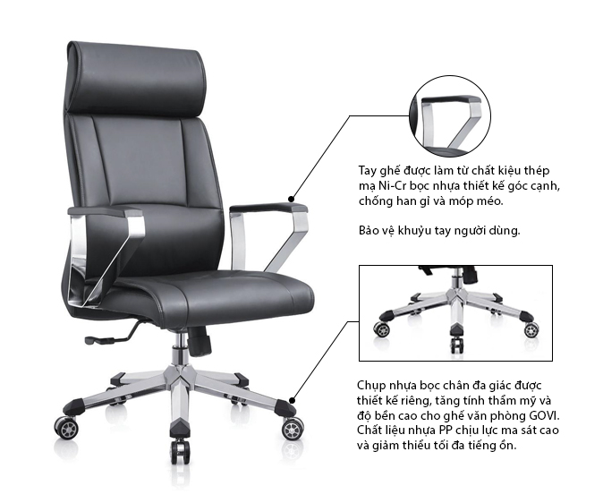 | Gia công cao cấp | Chân ghế được thiết kế mạ crom cao cấp, khung chân đa giác thiết kế độc quyền, bền, chắc, chịu tải trọng lên tới 200 kg. |