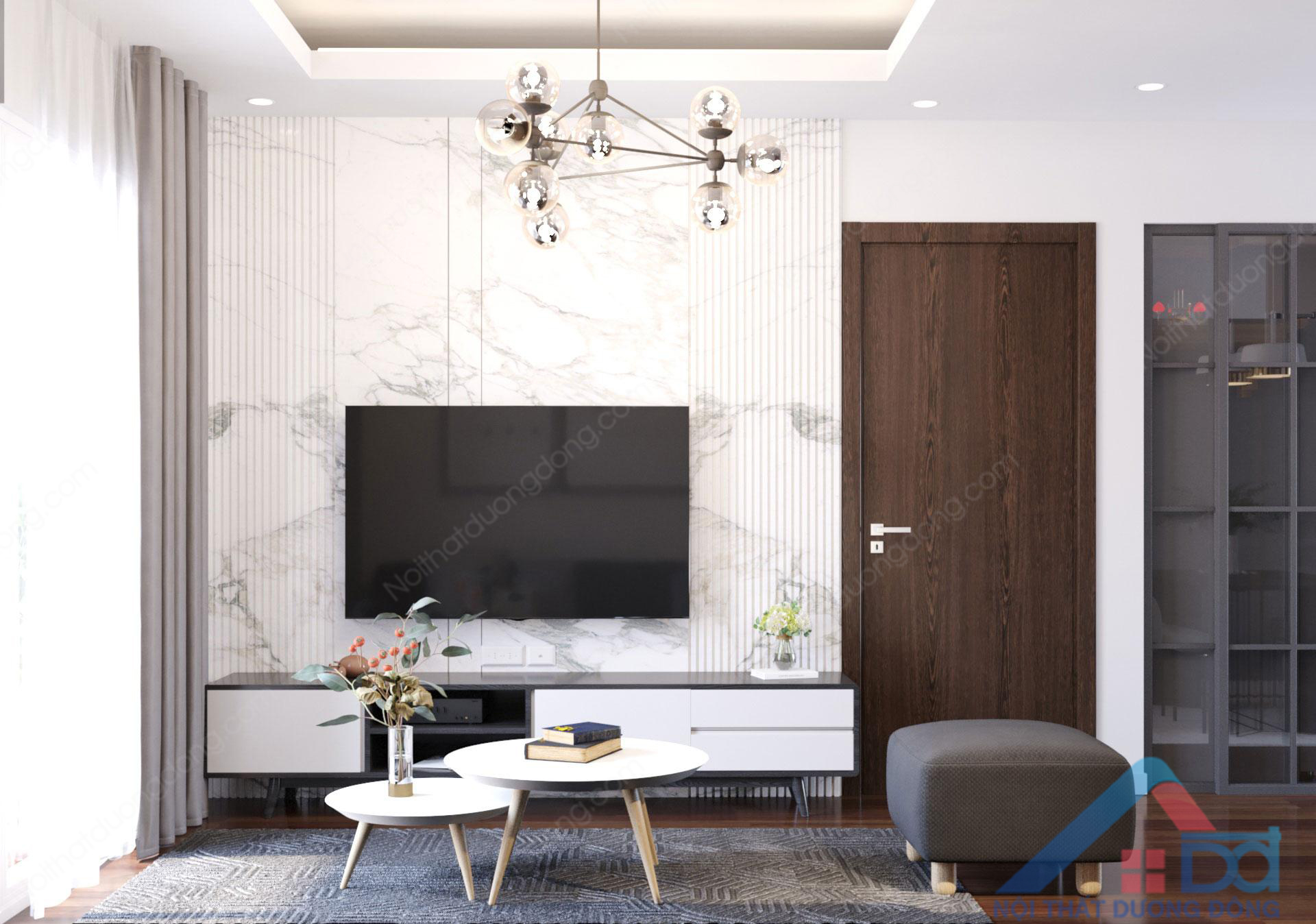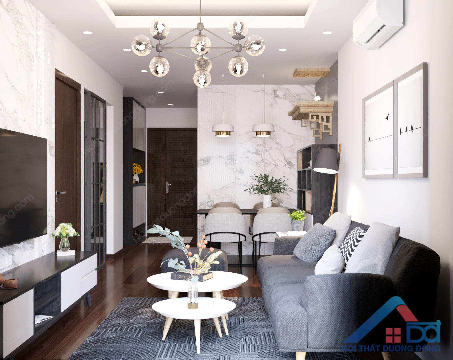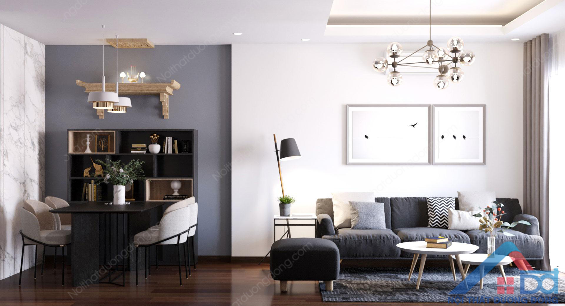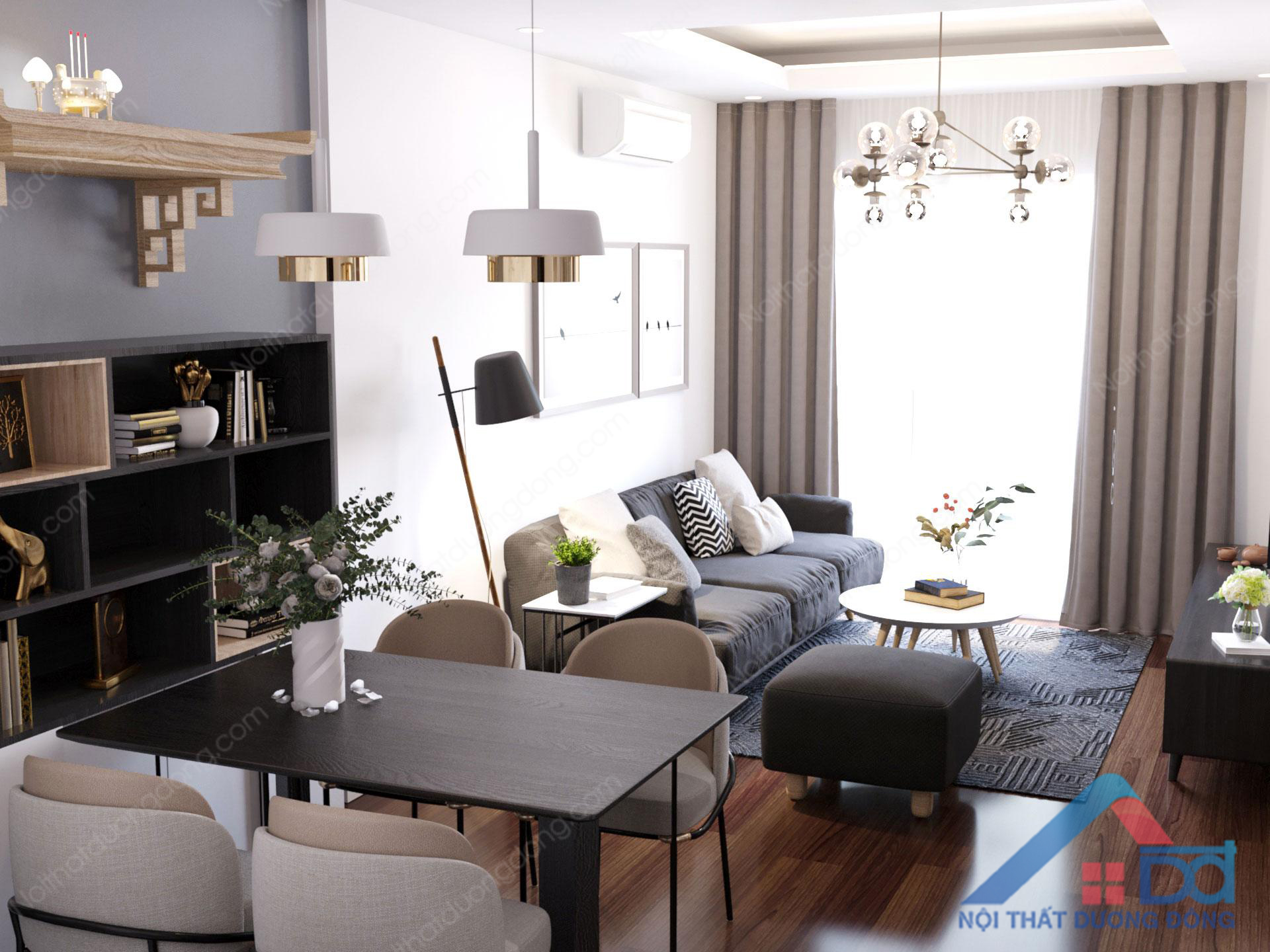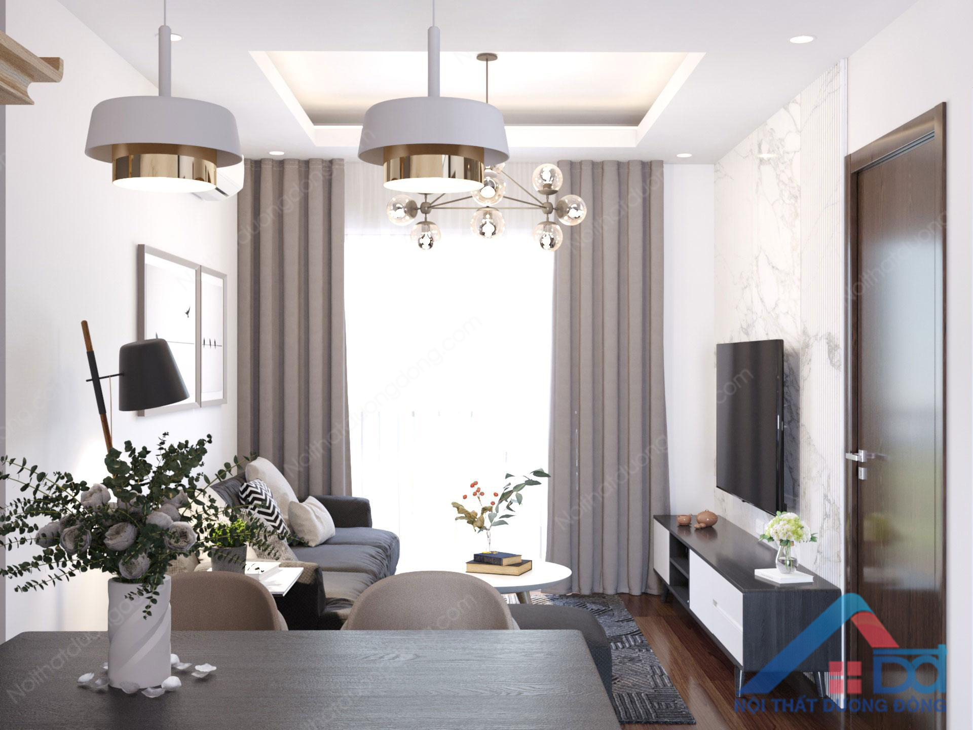 Diện tích thiết kế nội thất không quá rộng, công năng bố trí 2 phòng ngủ, yêu cầu và mong muốn của gia đình đã tiếp nhận đầy đủ, phương án thiết kế chung cư 50m2 nhanh chóng được chủ đầu tư chốt. Phòng khách thiết kế hướng ban công chings, thiết kế liền kề với phòng ăn của gia đình. Đèn treo kết hợp với rèm màu nâu cà phê sữa, đảm bảo sự cân đối và điểm nhấn trang trí hài hòa cho không gian.
