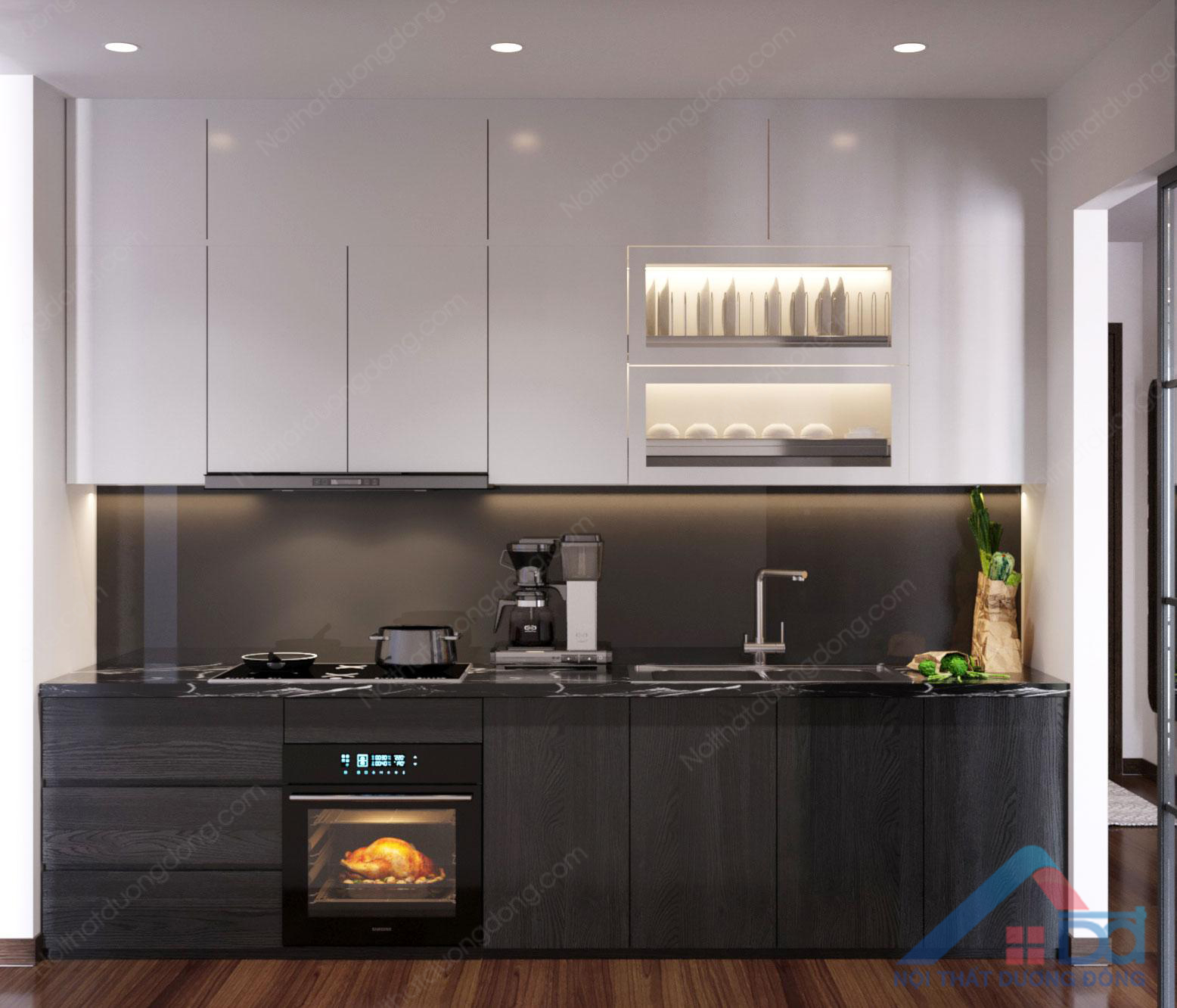 Bếp thiết kế tận dụng chữ I, kiểu kê sát tường, vừa chiếm ít diện tích, vừa có tính thẩm mĩ cao. Sự kết hợp tương phản của hai gam màu trắng và đen, cùng với thiết bị bếp hiện đại, đem lại sự mới mẻ và tràn ngập sức sống cho căn hộ. Thiết kế sát tường và cao sát trần, tận dụng và mở rộng không gian lưu trữ là điều rất cần thiết cho những căn hộ có diện tích nhỏ.