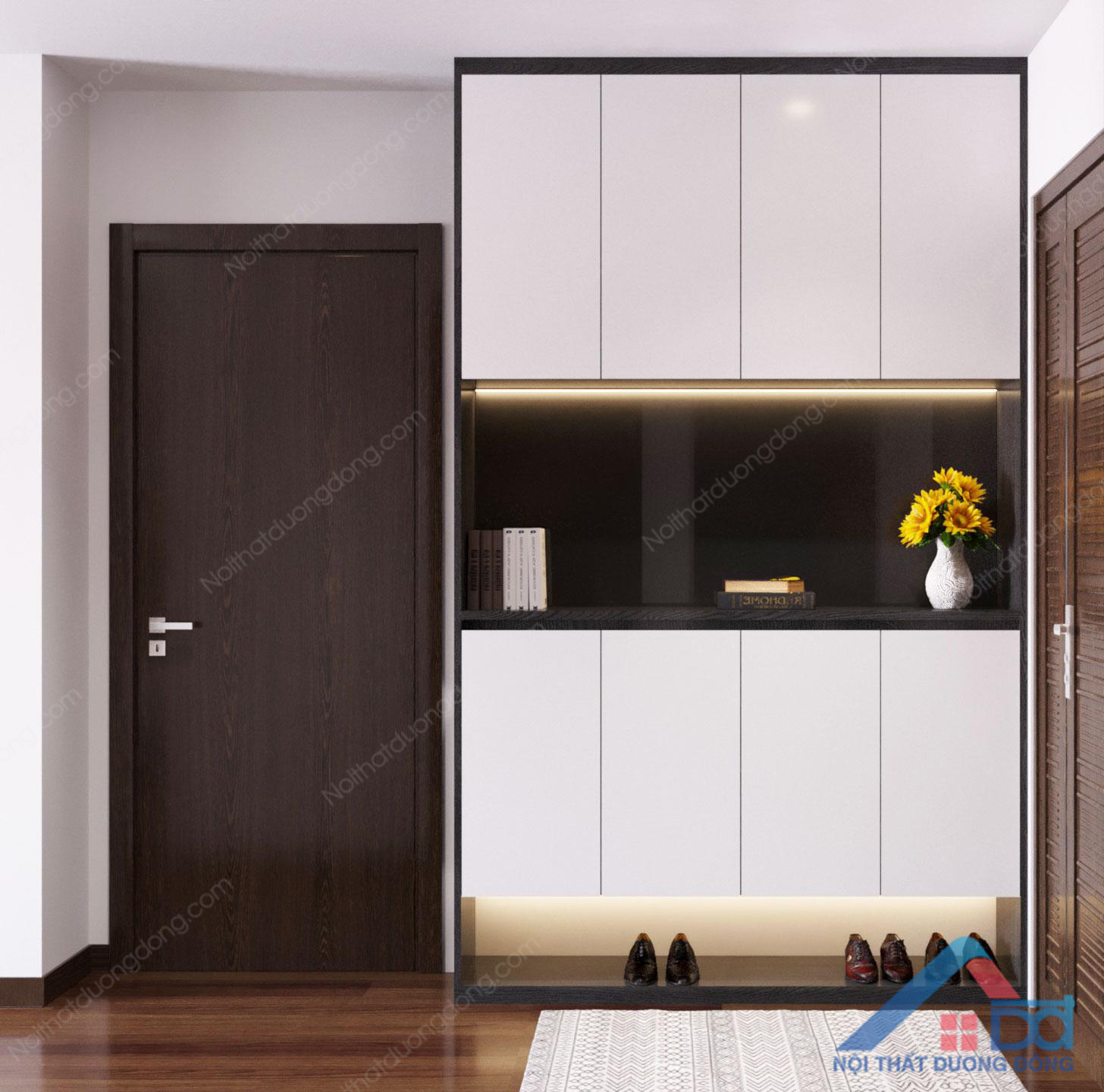 Diện tích nhỏ, việc tận dụng diện tích và không gian là điều cần thiết. Tủ đựng giày thiết kế cao sát trần, tích hợp nhiều ngăn mở và khoảng không ở giữa trang trí, tạo nên sự thu hút ngay khi bước vào. Cách xử lý này vừa tận dụng khoảng không của chiều cao, vừa tận dụng bề ngang tạo nên sự mới mẻ và độc đáo cho căn phòng trong phương án thiết kế nội thất chung cư tại Nguyên Tuân.