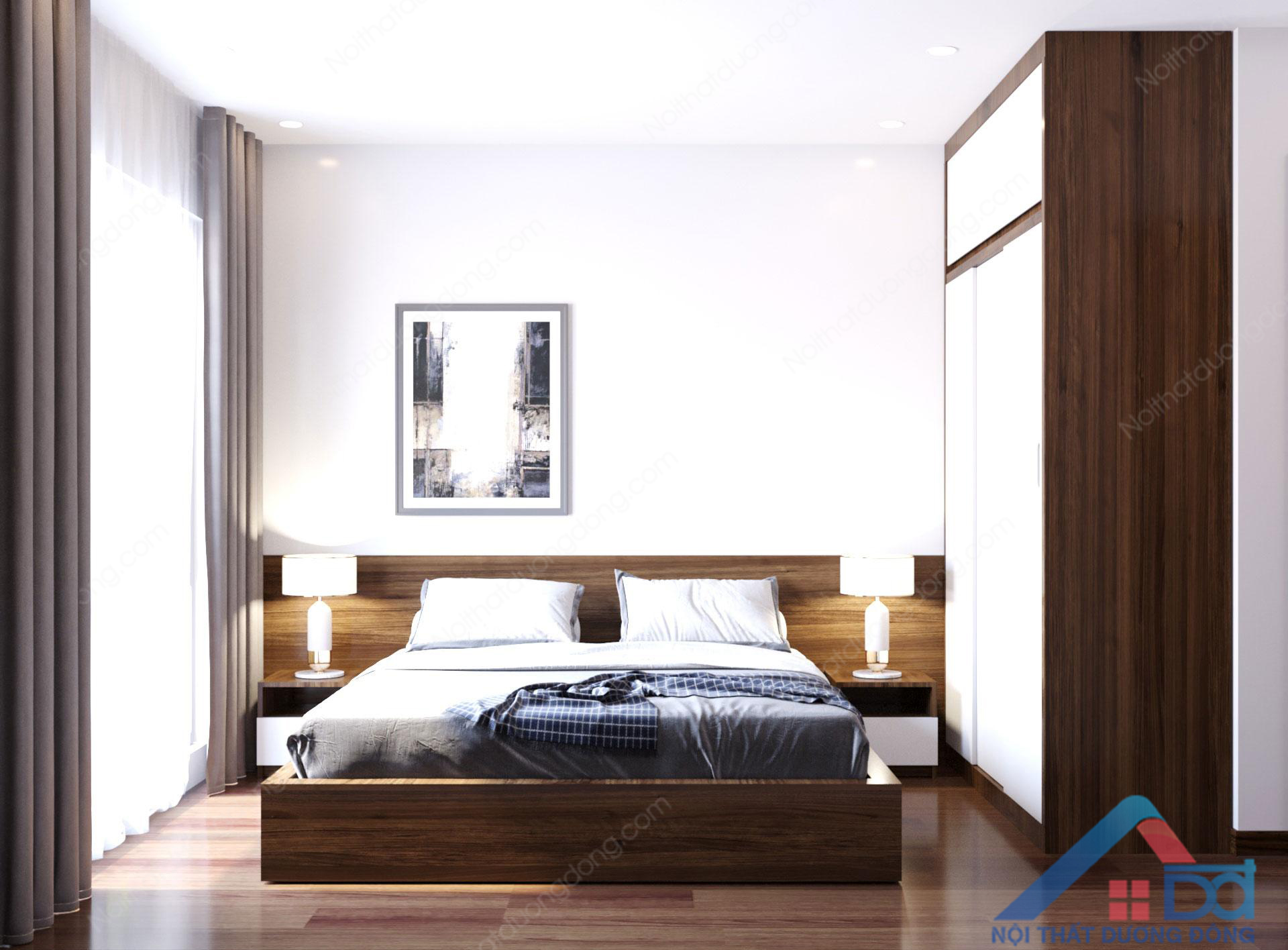 Bàn phấn nhỏ, thiết kế phía góc cuối chân giường, phía trên là giá treo tường gỗ đơn giản và bàn đọc sách thông minh phía cuối, tạo nên sự thuận tiện, tính thẩm mĩ khi sử dụng. Căn phòng của hai vợ chồng đón nhận được ánh sáng tự nhiên, nội thất bố trí tận dụng không gian cho nên căn phòng trông thoáng và rộng hơn diện tích sở hữu thực tế.