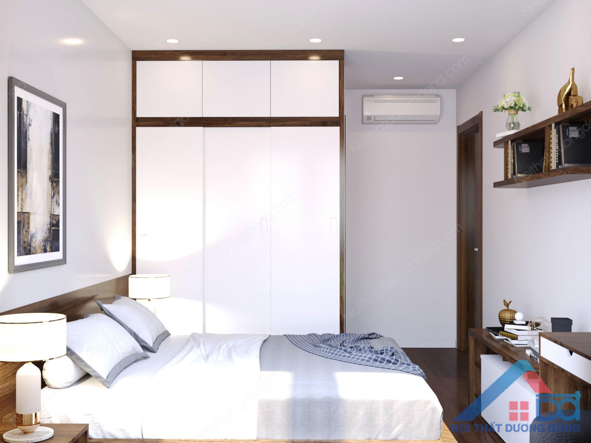 Kệ để đồ và giá treo tường được sử dụng một cách thông minh, tủ quần áo thiết kế cáo kịch trần và kê sát tượng là cách tận dụng khoảng không chiều cao một cách hiệu quả nhất. Tab nhỏ hai bên đầu giường với đèn để bàn tạo nên sự mới lạ và độc đáo cho căn phòng.