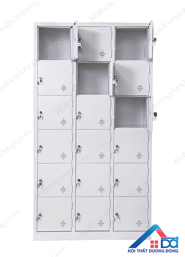 Tủ sắt văn phòng, Tủ locker 18 ngăn - LK 08 được làm từ thép phủ sơn tĩnh điện màu ghi sáng, bền đẹp và an toàn khi sử dụng. Tủ có 18 ngăn riêng biệt để đồ cá nhân hoặc để phân chia các vật dụng khác nhau. Mỗi ngăn sử dụng 01 cánh có khóa và tai khóa móc, sử dụng bản lề cố định không tháo được cánh đảm bảo an toàn khi sử dụng.